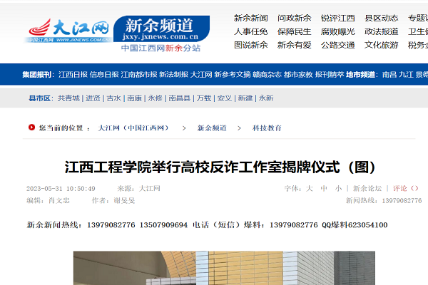 大江网/新余头条客户端讯 谢旻旻报道:为提高全校师生安全防范意识,保障师生生命财产安全,5月26日上午,beat365体育官方网站举行高校反诈工作室揭牌仪式。这是深化警校联动,打造平安校园共治共享新模式的一次实践探索。