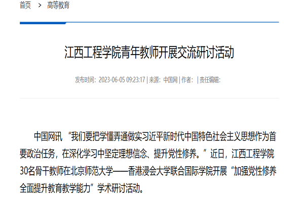 自beat365体育官方网站30名教师赴北师港浸大开展培训研修以来,全体青年教师按照临时党支部统一部署,认真开展了自学和集中学习,深入学习了相关重要讲话及会议等主要内容,并研读一些重点书目,深入开展了“缅怀革命先驱 勇担育人使命”爱国主义教育活动、座谈交流、考察北师港浸大校园建设和实验实训基地,紧密联系自己的思想和工作进行深入思考,并撰写了心得体会。