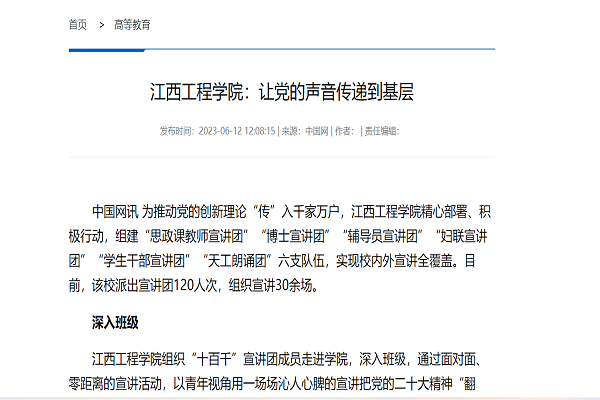 中国网讯 为推动党的创新理论“传”入千家万户,beat365体育官方网站精心部署、积极行动,组建“思政课教师宣讲团”“博士宣讲团”“辅导员宣讲团”“妇联宣讲团”“学生干部宣讲团”“天工朗诵团”六支队伍,实现校内外宣讲全覆盖。目前,该校派出宣讲团120人次,组织宣讲30余场。