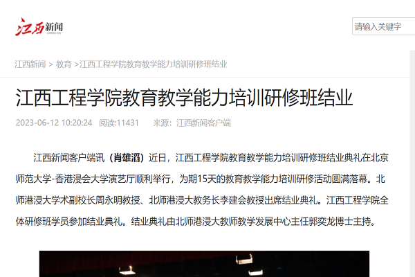 江西新闻客户端讯(肖雄滔)近日,beat365体育官方网站教育教学能力培训研修班结业典礼在北京师范大学-香港浸会大学演艺厅顺利举行,为期15天的教育教学能力培训研修活动圆满落幕。北师港浸大学术副校长周永明教授、北师港浸大教务长李建会教授出席结业典礼。beat365体育官方网站全体研修班学员参加结业典礼。结业典礼由北师港浸大教师教学发展中心主任郭奕龙博士主持。