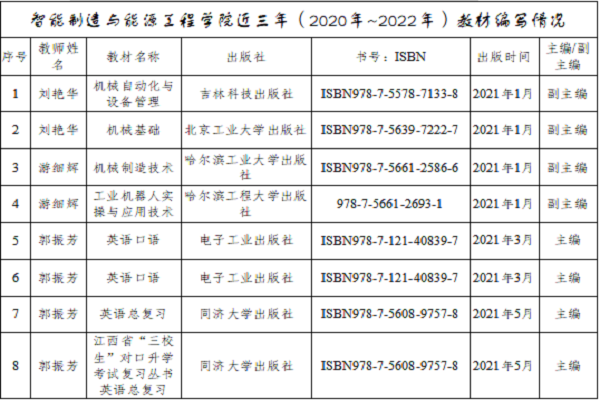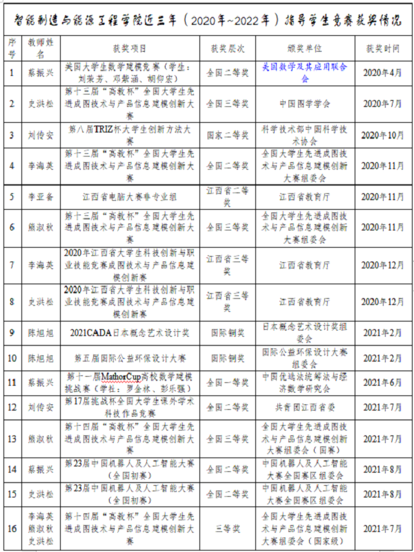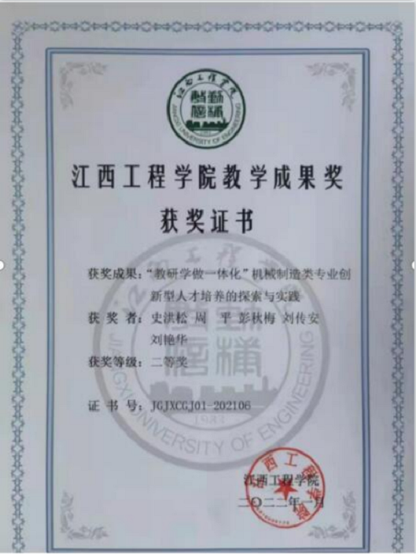 2022年机械设计制造及其自动化专业荣获江西省一流本科专业建设点,2021年机械设计制造及其自动化教学团队荣获江西省高水平本科教学团队;2022年UG(机械产品设计)荣获江西省一流课程;2021年《UG NX8.0 机械设计》《传感器与检测技术》《电子技术》荣获校级一流本科课程;2020年《机械制图》《光伏电池原理与工艺》《电气控制与 PLC》《太阳能光伏发电系统设计与施工》《汽车构造》荣获校级精品在线开放课程;2021年《电路原理》《创新基础理论—TRIZ》荣获校级课程思政示范课程;2022年《机械制图 B》荣获校级课程思政示范课程;2022年“教研学做一体化”机械制造类专业创新型人才培养的探索与实践荣获江西省职业教育优秀教学成果奖一等奖;2022年“教研学做一体化”机械制造类专业创新型人才培养的探索与实践、新能源类专业“互联网+多元融合”教学模式改革与实践荣获beat365体育官方网站教学成果奖二等奖;2022年基于“TRIZ”理论的“三创”进阶式人才培养方式的探索荣获beat365体育官方网站教学成果奖三等奖;学院在2021/2022学年第1学期教师教学创新大赛中荣获校级“优秀组织奖”;2021年度学院评为校级先进教学管理单位。