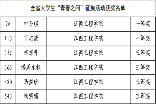 全省大学生“青春之问”征集活动中,共6名学生获奖。此次征集活动获奖名单如下:
