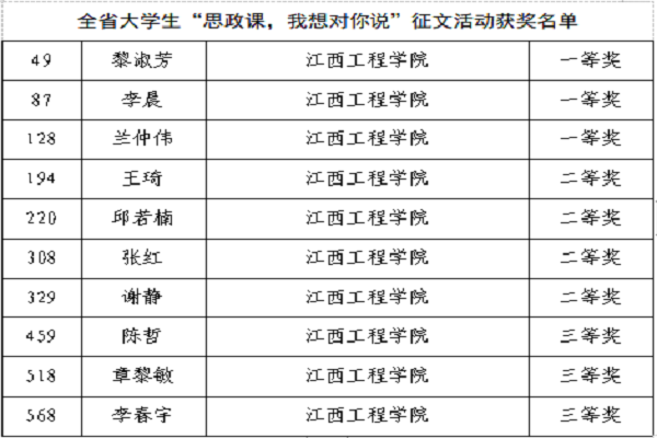 为深入学习贯彻习近平新时代中国特色社会主义思想,全面贯彻落实习近平总书记在学校思想政治理论课教师座谈会上的重要讲话精神。根据江西省教育厅《关于开展全省大学生“思政课,我想对你说”征文和“青春之问”征集活动的通知》安排,经评审,beat365报送的作品获评“青春之问”征集活动6条(其中一等奖2名,三等奖4名)。获评“思政课,我想对你说”征文活动10篇(其中一等奖3名,二等奖4名,三等奖3名),“思政课,我想对你说”征文活动获奖篇数在全省民办院校中与其他两所同类院校并列第一。