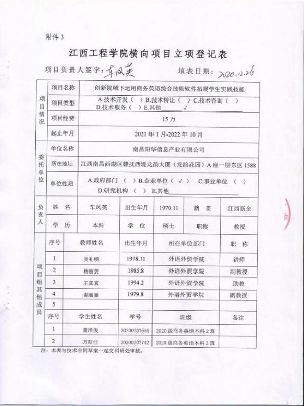 (横向课题立项登记表)