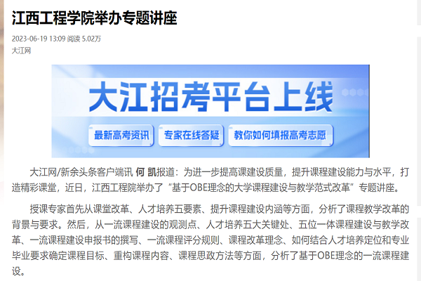 大江网/新余头条客户端讯 何 凯报道:为进一步提高课建设质量,提升课程建设能力与水平,打造精彩课堂,近日,江西工程院举办了“基于OBE理念的大学课程建设与教学范式改革”专题讲座。