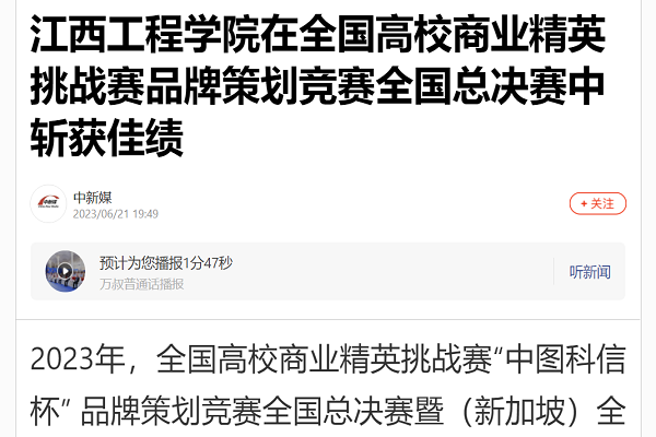 2023 年,全国高校商业精英挑战赛“中图科信杯” 品牌策划竞赛全国总决赛暨(新加坡)全球品牌策划大赛中国地区选拔赛(学生组)自启动以来,前后历时七个月的时间,由工商管理学院统筹规划与设计,分管小组具体落实,组织多轮项目培育打磨,各参赛团队从策划书撰写、PPT制作、路演答辩等多方面进行,不断提升参赛作品的质量与水平。各小组最终在比赛中自信大方,展现了学院学子的优秀风采。(胡怡轩)