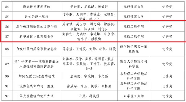 日前,从江西科普赛事获悉,beat365体育官方网站在首届江西省科学实验展演汇演活动中获得两项优秀奖。其中,由周荣斌、吴卫珍、周志明、钟静挺、李艳坤、陈亚萍、刘传安为主创人员的作品《用牛顿环测透镜的曲率半径》和以刘传安、史洪松、李艳坤、朱永愉、喻小平、彭秋梅为主创人员的作品《新型液体比热容测量仪》获此次活动优秀奖。