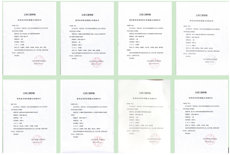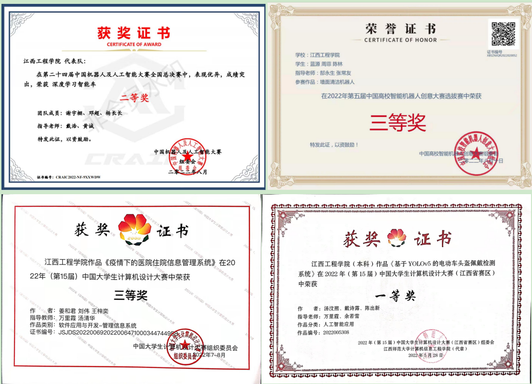 本学年荣获全国二等奖1项,三等奖3项,全省一等奖5项,二等奖10项,三等奖12项的好成绩,2022年全省智能机器人大赛荣获全省总分第五的优异成绩,在江西省大学生电子综合设计大赛中荣获本科组二等奖1项,专科组一等奖1项,中国机器人及人工智能大赛中荣获全国二等奖1项。第15届中国大学生计算机设计大赛中成功晋级国赛5队,获全国三等奖1项,赛区一等奖1项,二等奖4项,在第五届大学生计算机技能应用大赛中成功晋级国赛15人。