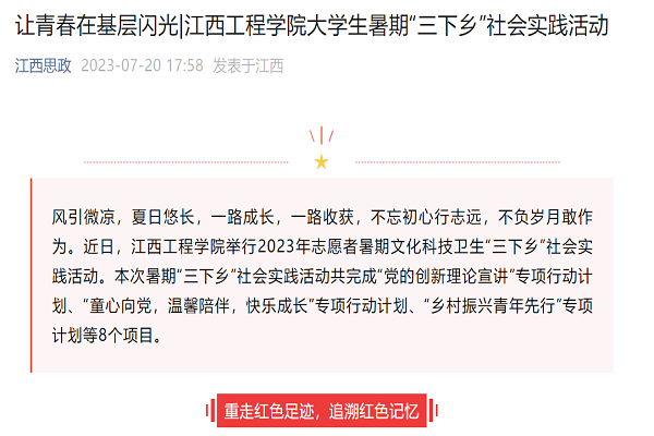 风引微凉,夏日悠长,一路成长,一路收获,不忘初心行志远,不负岁月敢作为。近日,江西工程学院举行2023年志愿者暑期文化科技卫生“三下乡”社会实践活动。本次暑期“三下乡”社会实践活动共完成“党的创新理论宣讲”专项行动计划、“童心向党,温馨陪伴,快乐成长”专项行动计划、“乡村振兴青年先行”专项计划等8个项目。