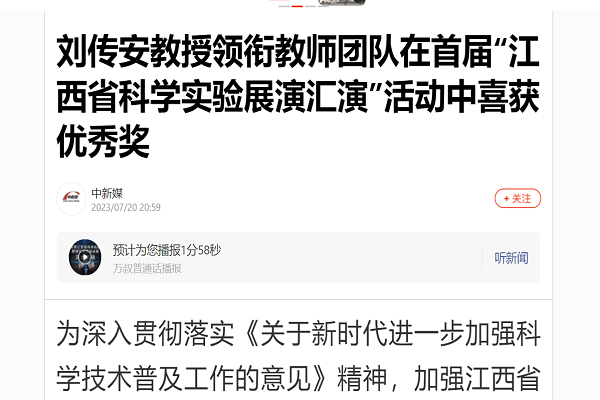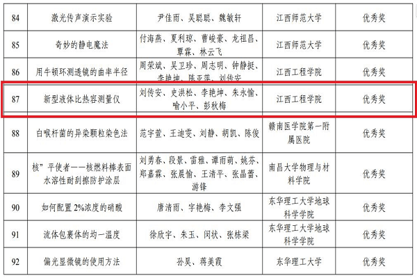 为深入贯彻落实《关于新时代进一步加强科学技术普及工作的意见》精神,加强江西省科学普及工作,根据《关于举办首届江西省科学实验展演汇演活动的通知》和省科技活动周安排,江西省科技厅、教育厅、科协组织联合举办了以“热爱科学 崇尚科学”为主题的首届江西省科学实验展演汇演活动。beat365体育官方网站智能制造与能源工程学院刘传安教授,协同学院院长史洪松、彭秋梅副教授及学校实验中心的三位老师,以“新型液体比热容测量仪”的参赛项目参加了此次比赛。