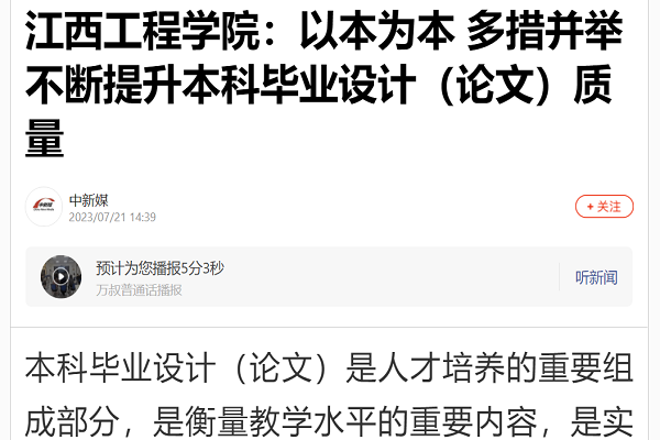 加强过程管理,确保质量。为实现论文信息化管理,学校加大投入,引进毕业论文查重系统、管理系统,借助信息平台,进一步强化过程管理。首先是严格遴选指导教师,要求教授、副教授必须指导本科生毕业设计(论文),同时选聘部分企业导师担任指导教师,优化了指导教师队伍。其次是抓住关键环节,明确工作重点,在开题、中期检查、答辩等关键环节发现的问题,采取有效措施,及时整改。并将典型问题形成具体的案例开展教研活动,逐步提高管理质量。第三是做好论文的查重检测,每篇论文须开展初稿、定稿和最终稿三次查重检测,重复率严格控制在30%以下,查重率偏高的退回重新修改并再次查重直至符合要求,确保论文质量有底线,学术诚信有红线。第四是毕业论文相关资料需要在系统填报,教学管理人员、指导教师、学生通过论文管理系统查看相关数据,及时调整工作进度,形成“人人、处处、时时”质量诊改的螺旋递进效应。第五是完善质量监测环节。教务处组织校内专家组深入学院开展初期、中期、答辩归档等各项专项检查,指出存在问题,采用现场当面反馈和书面形式反馈,要求及时整改。