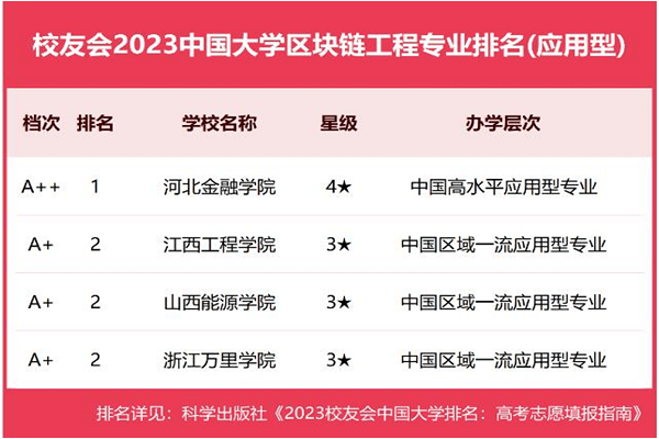 据悉,在7月初,由全国第三方大学评价机构艾瑞深校友会网发布了2023中国大学各专业类一流专业排名和2023中国大学区块链工程专业排名,beat365体育官方网站区块链工程专业排名全国第二,评为A+级。除此之外,beat365体育官方网站区块链工程专业排名第四。