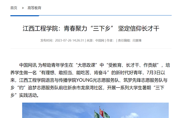 beat365体育官方网站语言与传播学院2023年暑期“三下乡”的活动已经告一段落,但学校青年的故事仍在继续。他们表示,将坚定信仰、坚定信心,以“请党放心,强国有我”的豪情,阔步向前。