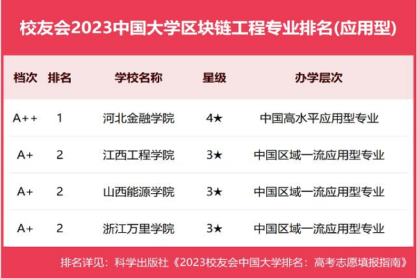 由全国第三方大学评价机构艾瑞深校友会网(Cuaa.Net)撰写完成、科学出版社正式出版发行的《2023校友会中国大学排名—高考志愿填报指南》发布了2023中国大学各专业类一流专业排名,最新发布了校友会2023中国大学区块链工程专业排名,学校区块链工程专业排名全国第二,评为A+级。
