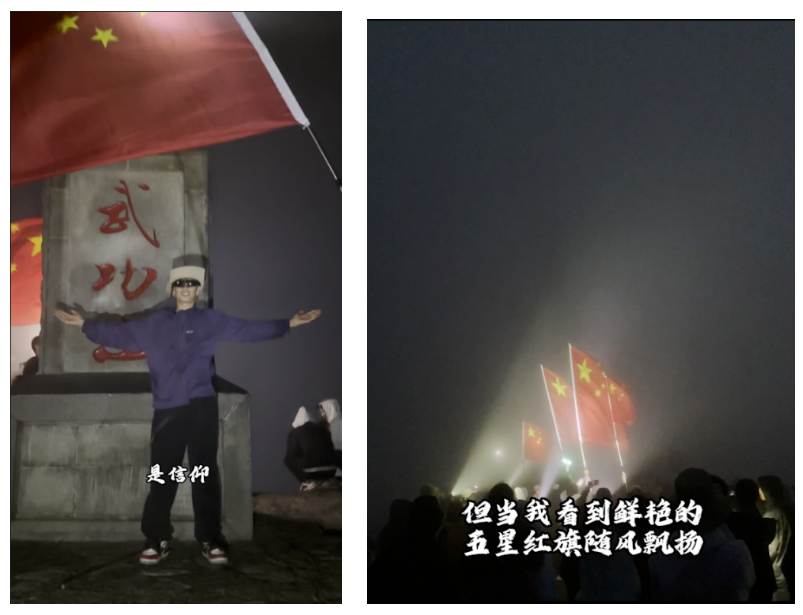 “出发第一天心情是兴奋的、激动的,心里充满了期待”,伴随着许巍的《蓝莲花》,许卫文到达第一站:萍乡武功山,“登顶后,看到鲜艳的五星红旗随风飘扬,我全身注满了力量,今天的疲惫随之退去,这就是信仰的力量”。
