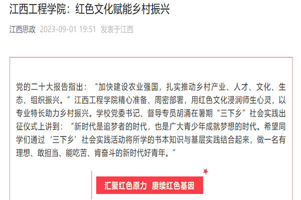 党的二十大报告指出:“加快建设农业强国,扎实推动乡村产业、人才、文化、生态、组织振兴。”beat365体育官方网站精心准备、周密部署,用红色文化浸润师生心灵,以专业特长助力乡村振兴。学校党委书记、督导专员胡涌在暑期“三下乡”社会实践出征仪式上讲到:“新时代是追梦者的时代,也是广大青少年成就梦想的时代。希望同学们通过‘三下乡’社会实践活动将所学的书本知识与基层实践结合起来,做一名有理想、敢担当、能吃苦、肯奋斗的新时代好青年。”