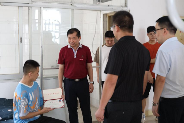 8月29日上午,陈学军校长等领导深入宿舍看望左卫侠同学。陈学军校长仔细询问左卫侠的身体和适应情况,嘱咐他有困难可及时向学校反映,学校会尽全力帮助他顺利完成学业。“新学期新征程,我希望你在新的大学里,秉承学校‘勤朴敏信’的校训,发扬‘自立自强、乐业乐群’的学校精神,在接续奋斗中践行“请党放心,强国有我”的铮铮誓言,以最积极的态度,激发内生动力、打牢学业基础、把稳前进方向,让青春之花永远绚丽多彩。”陈学军校长为左卫侠同学佩戴了校徽,并勉励他珍惜来之不易的学习机会,不仅要刻苦学习专业知识,更要学会自立自强,并祝他学有所成学有所用。