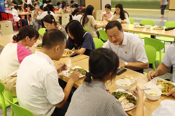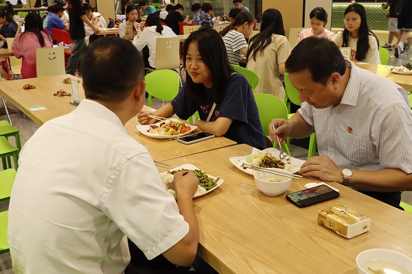 “我今天不是第一次与胡涌书记一起吃饭,上学期我就和他一起吃过饭。其实我们来食堂吃饭,每周都可以碰见校领导好几次。校领导不但陪餐,而且非常关心学校食堂的食品安全,这让我们对学校的食品安全更加放心了。”一名用餐学生说到。