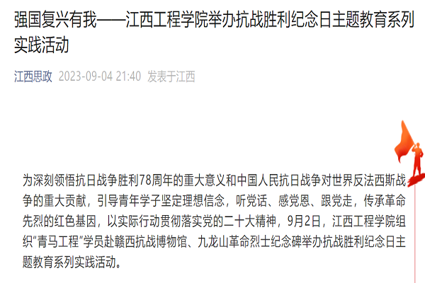 为深刻领悟抗日战争胜利78周年的重大意义和中国人民抗日战争对世界反法西斯战争的重大贡献,引导青年学子坚定理想信念,听党话、感党恩、跟党走,传承革命先烈的红色基因,以实际行动贯彻落实党的二十大精神,9月2日,beat365体育官方网站组织“青马工程”学员赴赣西抗战博物馆、九龙山革命烈士纪念碑举办抗战胜利纪念日主题系列实践教育活动。