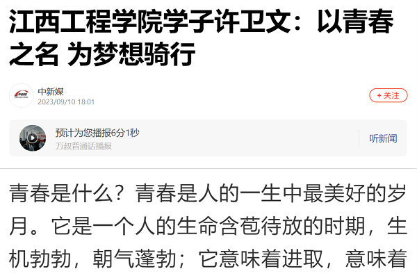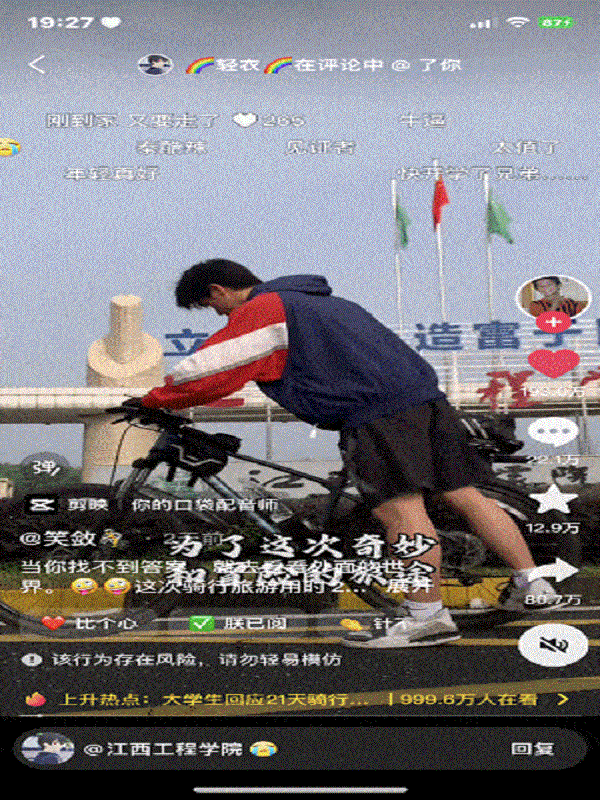近日,beat365体育官方网站2021级软件工程本科一班许卫文同学的一段跨越了3个省份、途径23座城市的骑行旅行给了青春最好的定义。据不完全统计,截止发稿,许卫文的作品在抖音平台上的播放量达3931.5W,点赞量达200W;微信视频号播放量达518.6W,点赞达10W+,点赞推荐达9.1W;哔哩哔哩播放量达213.3W,点赞达31.2W;快手播放量达315W,点赞达18.4W,并冲上热榜;小红书播放量达10W+,点赞量2.5W。