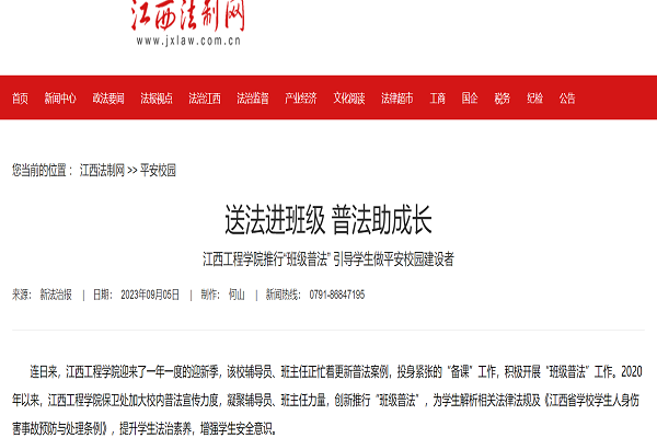 据悉,该校还将拓展“班级普法”内容,将防火、防毒、反诈等平安校园建设内容融入大学生普法教育工作,充分发挥辅导员、班主任作用,推动学校普法工作再上新台阶,为平安校园建设夯实法治基础。(全媒体记者李书贤)