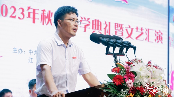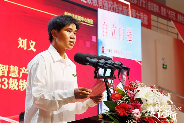 智慧产业学院2023级软件工程1班刘义表示很荣幸能代表大一新生发言。他说到大学生活是人生新的起点,要以此为跳板,踏上社会的舞台。我们要尽快适应新的大学生活,树立目标,与其将希望挥霍一空,不如踏踏实实走好脚下的路,一步一步走向成功。