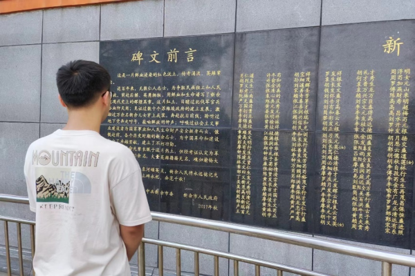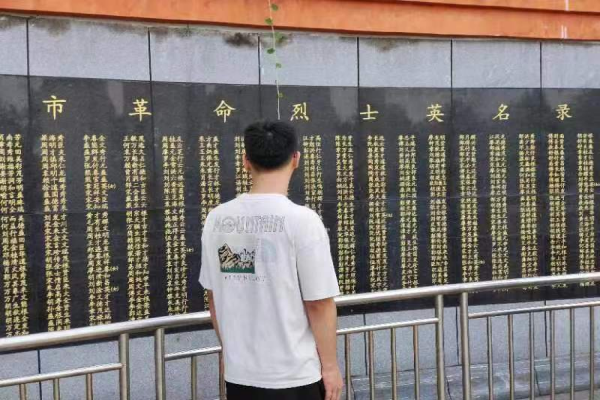 我们来到了纪念广场,映入眼帘的是一片绿意盎然的山林,略显巍峨,但不失大气,走到台阶下,由下往上看是一段略长的阶梯,最高处是便是那烈士纪念碑。我们走过了一段路,来到广场中央,再往上,走过那略长的台阶,我们来到了半山腰。在那里,我们终于看到了新余烈士纪念碑。踏着台阶走上来,一步一步都是沉重,直到走上平台,看到那些刻在黑色冰冷石碑上的名字,闪耀着金色的光辉。那些本该鲜活灿烂的生命,却都为了心中的理想和信念奉献了自己的生命,但他们都是骄傲的,无悔的。想来我们都生活在新的时代,无法想象那种枪林弹雨,国家家园危亡重任在肩的感觉。但来到这里,不禁让人心情沉重。回忆往昔,亿英烈往者睁嵘岁月,思吾辈今日当砥砺前行。我想我们要永远铭记革命先烈的革命英雄气概,爱祖国、爱人民、爱脚下每一片热土,勇于牺牲、敢于胜利!先烈们,我们一定会珍惜今日来之不易的幸福生活,坚定共产主义信念,心怀远大理想。努力学习,奋发向上,报效祖国和人民。“先烈回眸应笑慰,擎旗自有后来人”!