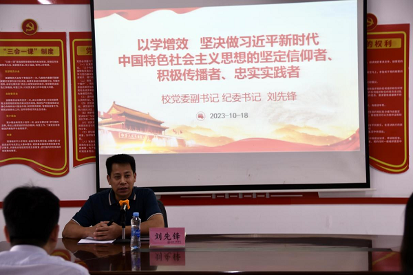 课上,刘先锋强调,要准确理解“学思想”这个基础,坚持思想建党、理论强党,持续用党的创新理论最新成果武装全党。他分别从提高站位自觉学、研机析理用心学、带着问题思考学、结合实际深入学四个方面,向与会师生党员强调,要把理论学习作为主题教育的重中之重,全力做好学习贯彻习近平新时代中国特色社会主义思想的深化、内化、转化工作,将理论学习成果转化为解难题促发展的强大动力。
