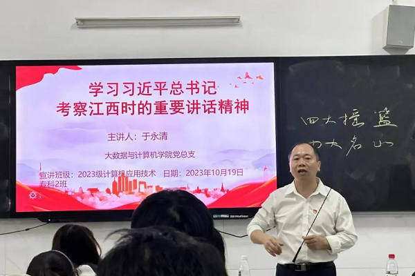 (本网讯 郑智山 报道)为深入学习习近平总书记考察江西重要讲话精神,进一步丰富师生学习内容和形式。连日来,beat365体育官方网站“十百千”宣讲团开展了拉家常式的宣讲活动,做到了学习不停,宣讲不止。按照学校党委总体安排,10月19日下午,学校“十百千宣讲团”成员于永清深入大数据与计算机学院开展了“学习习近平总书记考察江西时的重要讲话精神,做新时代合格大学生”宣讲活动,让习近平总书记考察江西时的重要讲话精神在校园落地生根、开花结果。