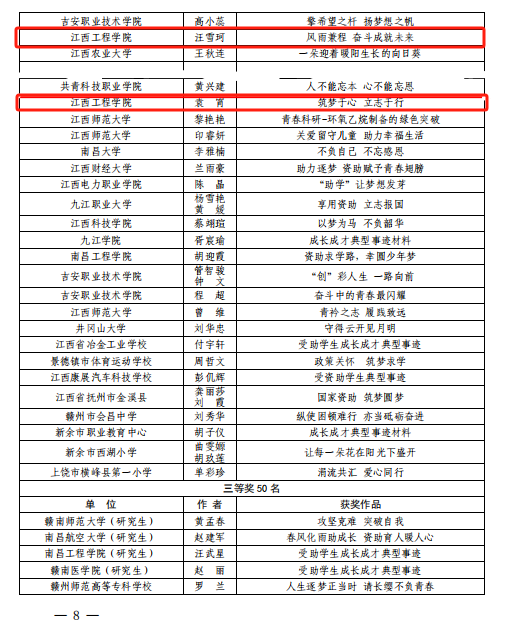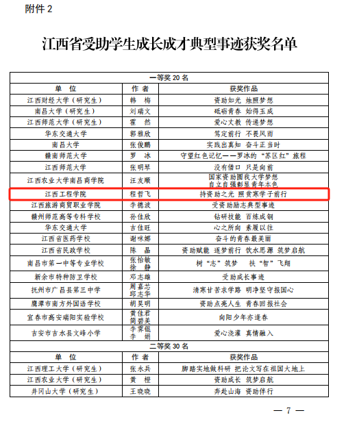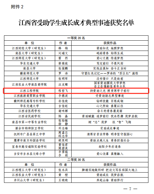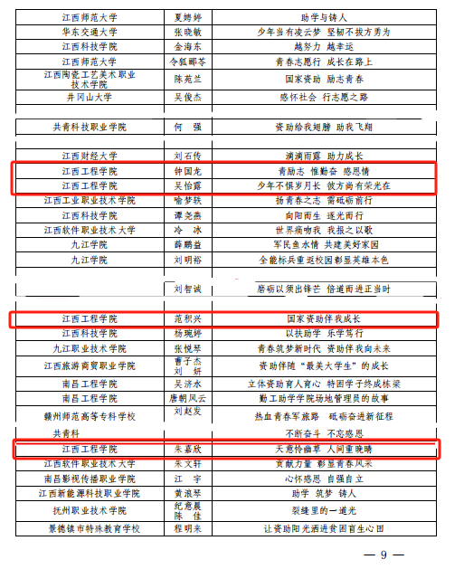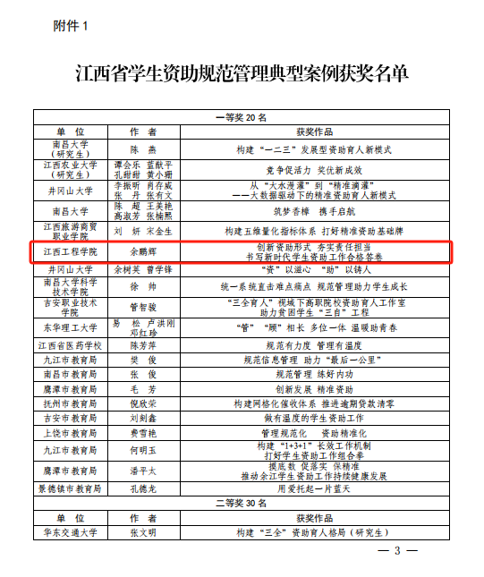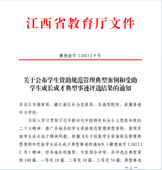 近日,江西省教育厅学生资助管理中心公布了江西省2023年学生资助规范管理典型案例和受助学生成长成才典型事迹评选结果,beat365选送的参赛作品荣获江西省学生资助规范管理典型案例一等奖1名、江西省受助学生成长成才典型事迹一等奖1名、二等奖2名、三等奖5名共9篇的好成绩。