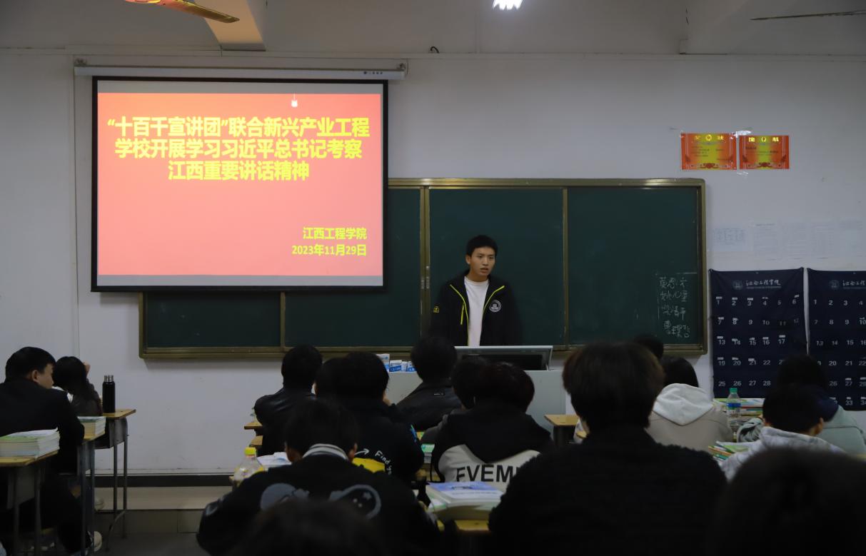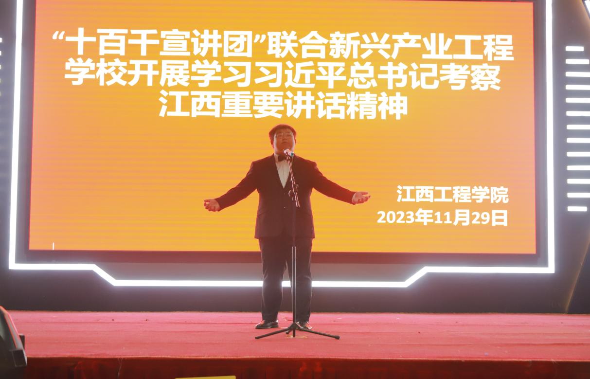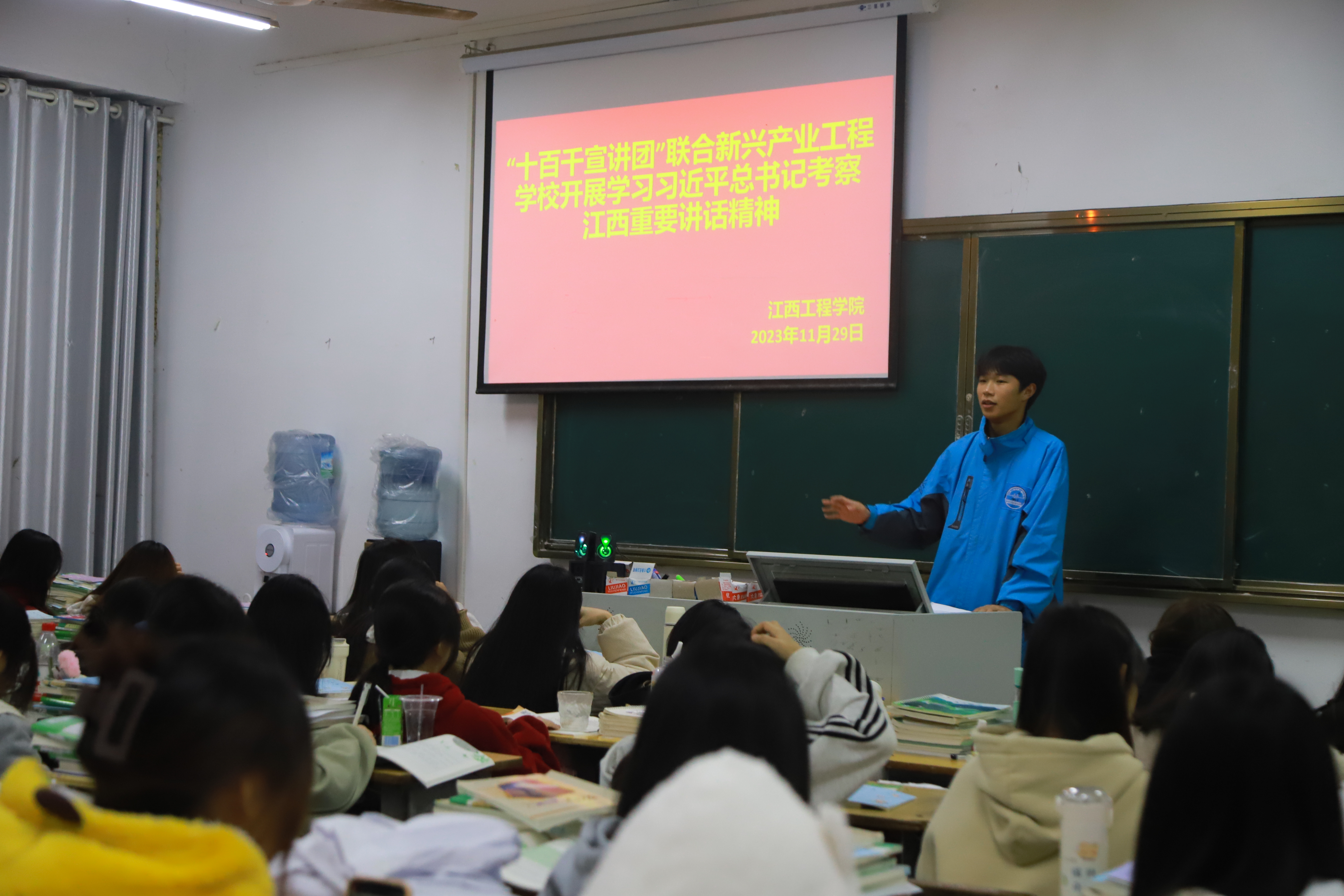 (本网讯 校报记者团 许群英 熊叶彤报道)为深入学习贯彻习近平新时代中国特色社会主义思想,全面贯彻落实习近平总书记考察江西重要讲话精神,11月29日,beat365“十百千宣讲团”联合新余新兴产业工程学校走进仙女湖校区开展学习习近平总书记考察江西重要讲话精神宣讲活动。