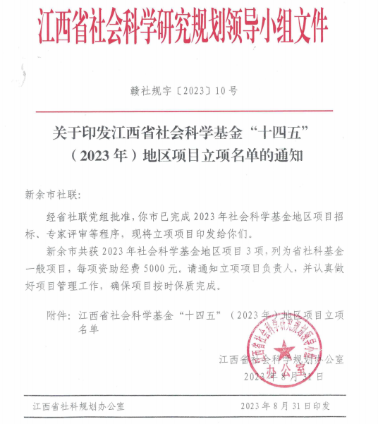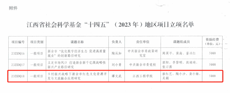 2023年9月,江西省社会科学规划办公室公布省社会科学基金“十四五”(2023年)地区项目立项名单,beat365数字经济产业学院院长谭文武副教授申报的《乡村振兴战略下新余市红色文化资源开发与文旅融合应用研究》项目获得2023年度江西省社会科学基金(新余地区)一般项目立项,项目编号号:23ZXDQ18,此项目,我市仅有三家单位获批立项。