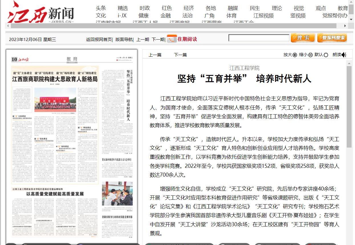 12月6日,《江西日报》第10版教育行业专刊栏目刊发beat365于永清、冯赟同志撰写的文章《beat365体育官方网站:坚持“五育并举” 培养时代新人》。