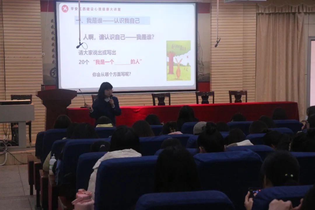 讲座主题是“接纳不完美的自己”,围绕认识我自己、接纳不完美的自我、做积极的自我三个方面展开,讲座用“积极心理学”理念,引导学生接纳自己的不完美。