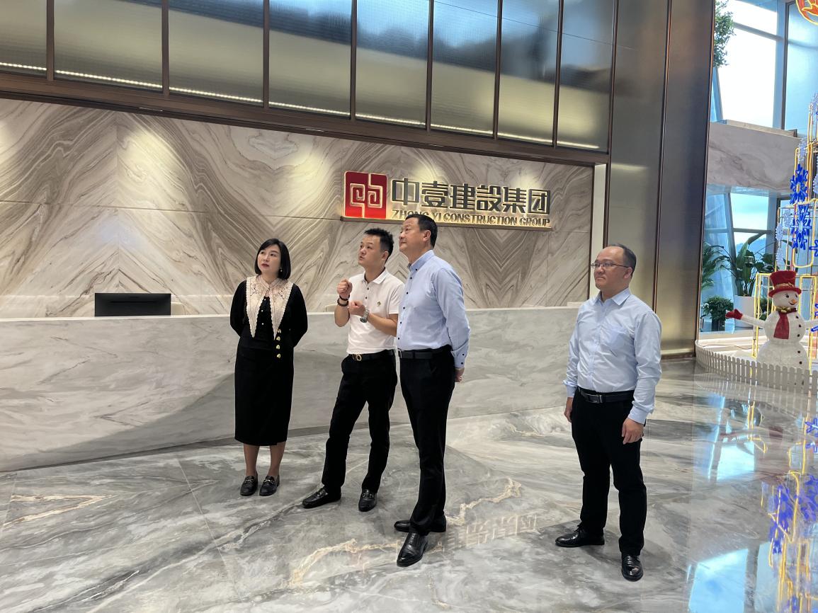 在中壹建设集团,胡涌书记一行在经营副总杜允鸿、公共环境设计院院长范宇的引导下,参观了中壹建设集团现代化的办公大楼,并听取了关于公司发展历程、业务范围及核心项目的详细介绍。中壹建设集团作为一家创办于2004年的民营建筑装饰企业,凭借其“大规模、高品质、精计算、尖技术、优服务”的经营理念,已经发展成为注册资金2.4亿元的业界翘楚。