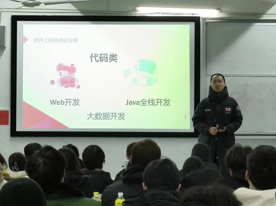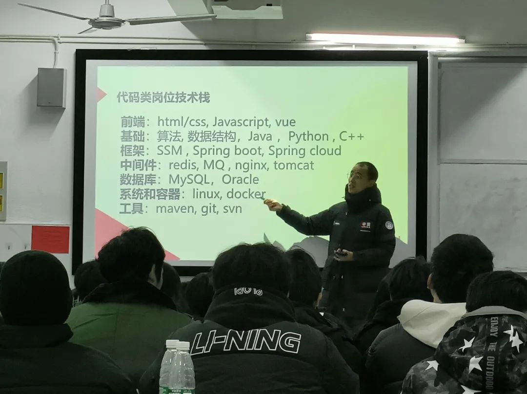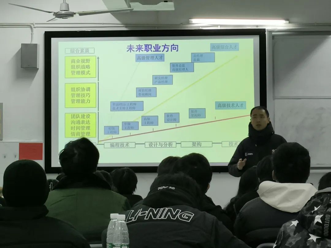 随后,江勇提到软件工程师的岗位分析可分为两大类:代码类和非代码类。代码类对Web开发和Java全栈开发要求非常高,而非代码类对测试和运维要求偏高。而对于大学生未来职业方向,他给出三条建议,让同学们进行选择比较,成为高级技术人才和高级管理人才;也可以二者兼得,成为高级综合人才。