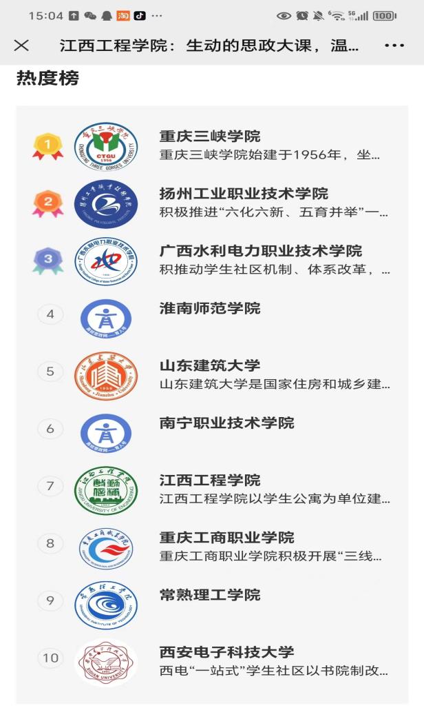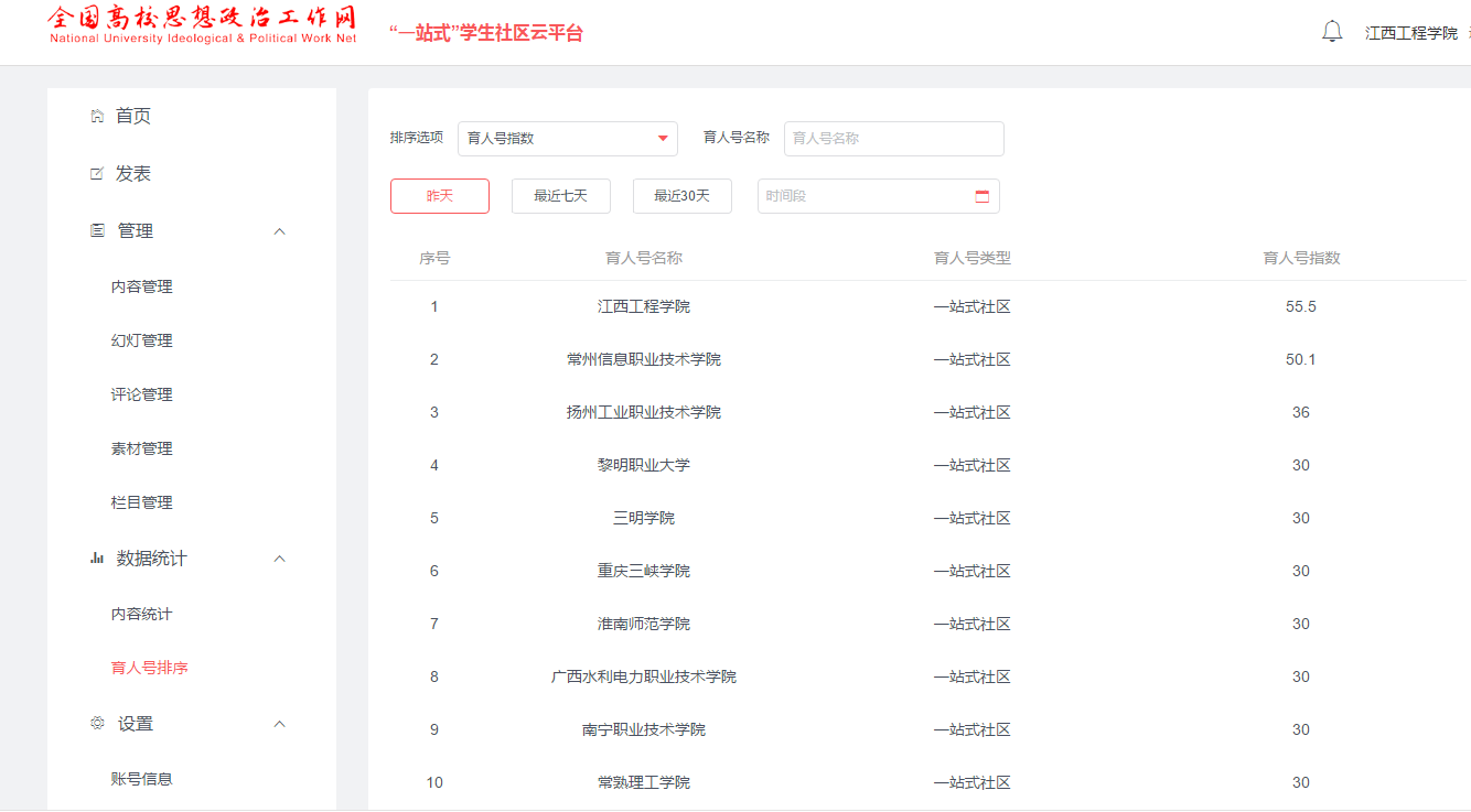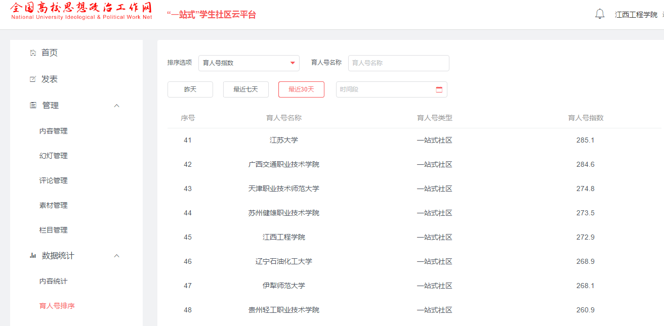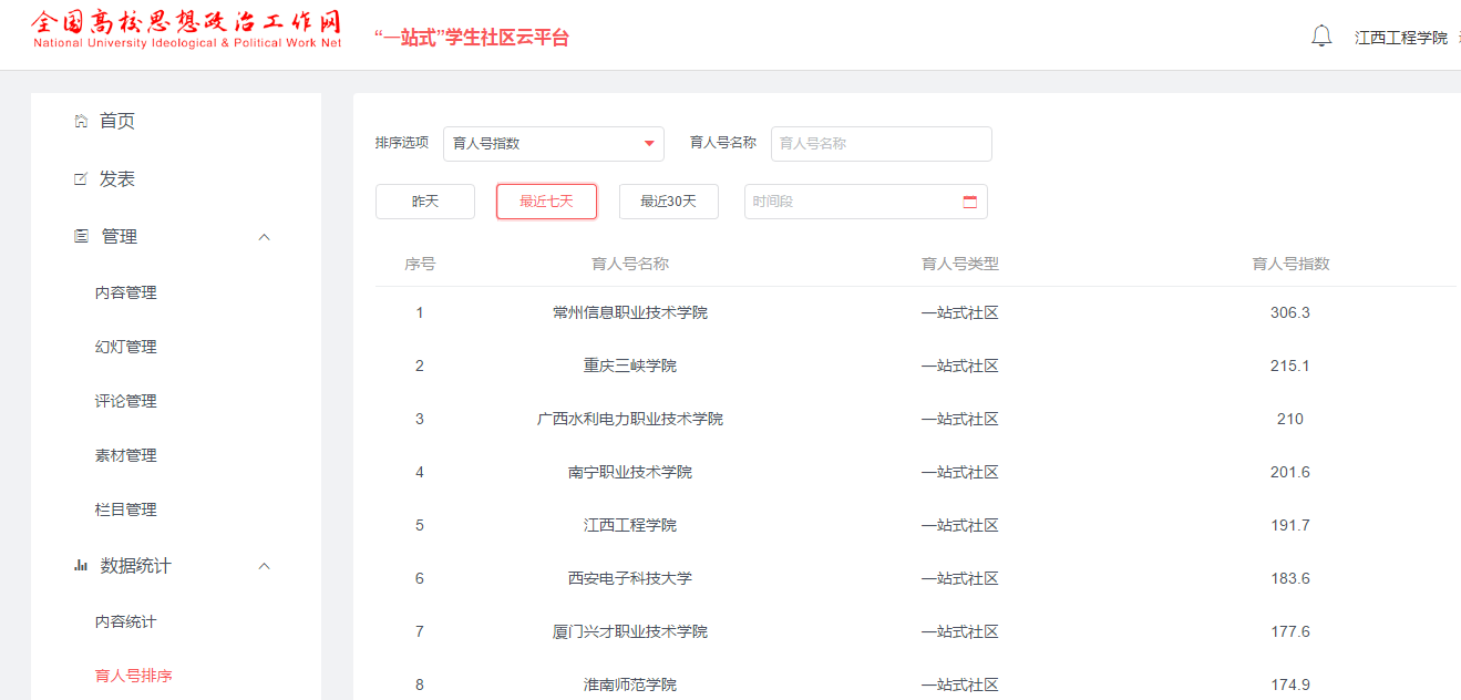 全国高校思想政治工作网录用beat365“一站式”学生社区稿件150余篇。beat365一站式学生社区“育人号”投稿发布内容长期以来备受社会各界和各大高校关注,多次荣登热度榜前10名,在全国高校思想政治工作网云平台“育人指数”排名中“日育人指数”多次位列全国第一,“周育人指数”多次位列全国前10名,“月育人指数”多次位列全国前10名、长期位列全国高校前50名。