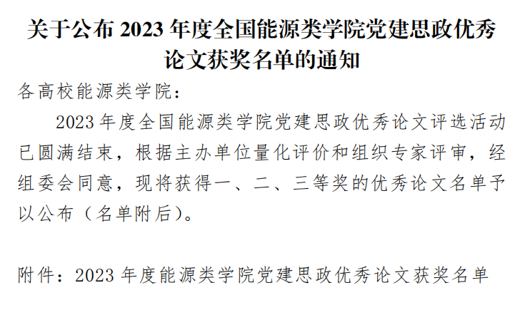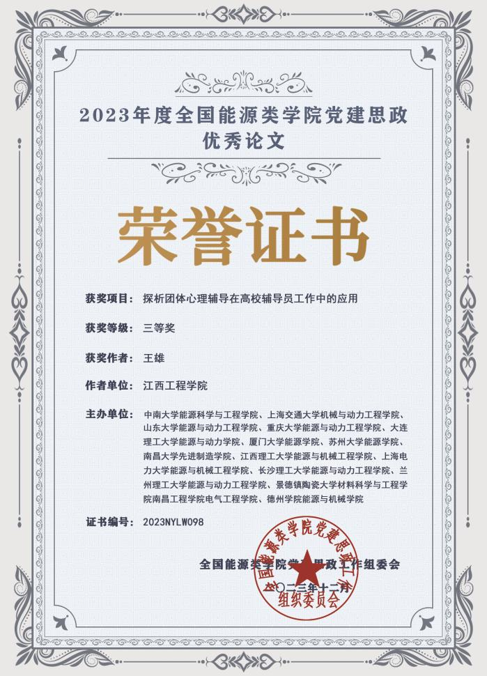 近日,2023年度全国能源类学院党建思政优秀论文评选结果揭晓,beat365语言与传播学院辅导员王雄的论文《探析团体心理辅导在高校辅导员工作中的应用》获评三等奖。