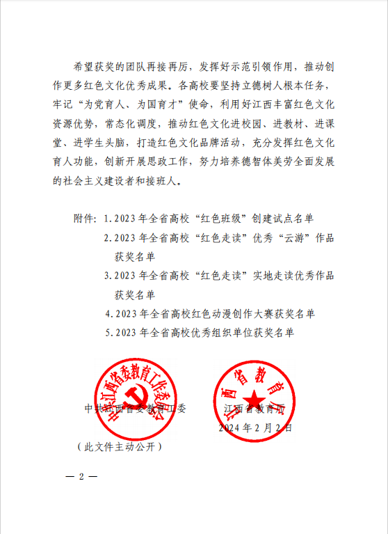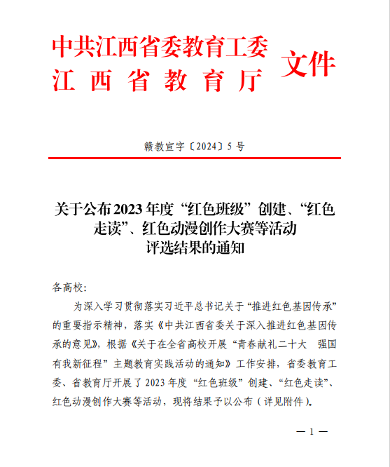 (本网讯 谢旻旻 报道)近日,中共江西省委教育工委、江西省教育厅公布了2023年度全省高校“红色班级”创建、“红色走读”、红色动漫创作大赛等活动评选结果名单,beat365再次取得突破,获得优异成绩。