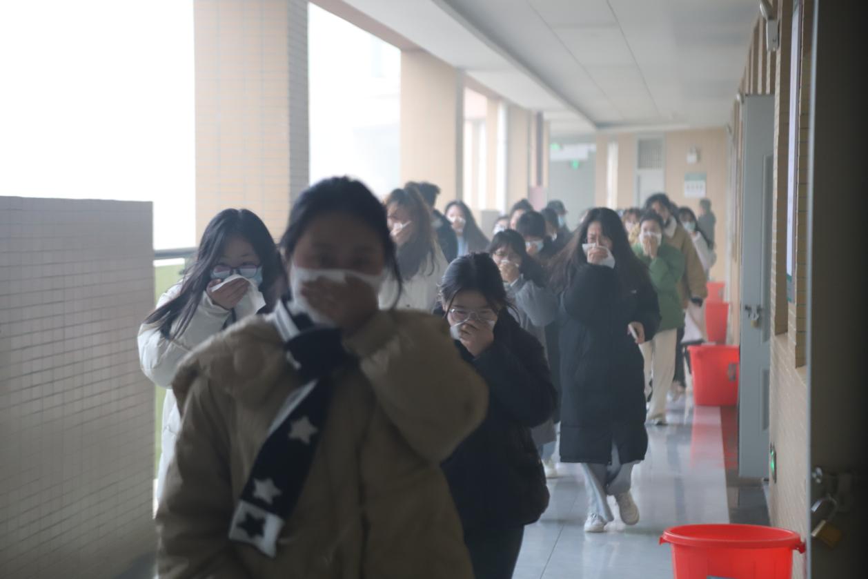 演练模拟教学楼突发火灾,预设警报声响起,应急疏散演练开始。学生们听到警报声时,用手捂住口鼻,弯腰俯身,贴着墙脚,保持着安全距离,按指定路线快速、有序、安全地撤离至教学楼前的空地上,整个疏散过程,没有出现拥挤推搡现象,做到了井然有序。