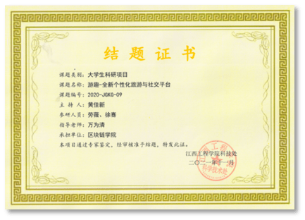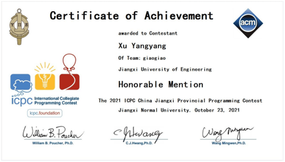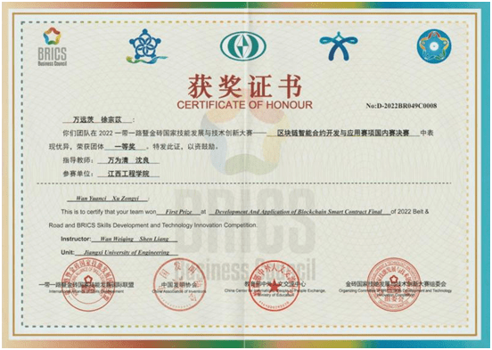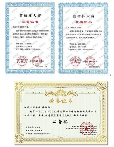 学院大力弘扬赛事文化,重视“以赛促学”。学生获得“一带一路暨金砖国家技能发展与技术创新大赛之区块链智能合约开发与应用比赛”全国总决赛一等奖,“蓝桥杯”全国赛二等奖2人/次、全国赛三等奖1人/次、全国优秀奖3人/次,江西省赛一等奖6人/次、二等奖10人/次、三等奖15人/次;获得第四届“传智杯”全国大学生程序设计赛二等奖2人、优秀奖2人;获得江西省信息技术知识赛一等奖9人/次、三等奖1人/次。获得“新道杯”全国大学生区块链应用技能大赛全国三等奖。在ACM-ICPC大学生程序设计赛中,学院参赛团队荣获Honorable Mentions奖。在全国第二届“网鼎杯”网络安全大赛中,学院“区块链”代表队获得93个积分,进入高校组前20名。