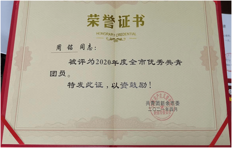 周铭,在大学期间,积极投入疫情防控工作,响应beat365号召,积极投入家乡志愿者工作,认真配合老师工作,服务本班同学,大一上学期加入beat365体育官方网站校团委学生会,参加和筹备大小活动百余场,大二上学期担任beat365体育官方网站校团委学生会副主席,曾荣获beat365体育官方网站优秀共青团员,beat365体育官方网站优秀共青团干部,新余市优秀共青团员,井冈山优秀学员等荣誉称号。