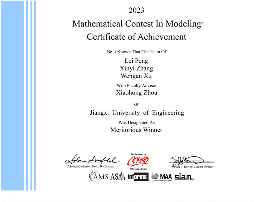 2023年5月,学院许文淦参加美国大学生数学建模竞赛,荣获赛事的Meritorious Winner(国际一等奖)。