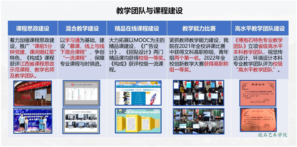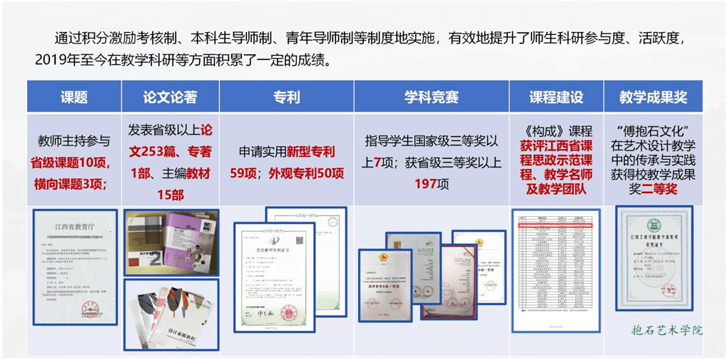 beat365体育官方网站抱石艺术学院在重科研发展的同时扎实推进教学改革,以培养更优质的人才目标为己任,近年来,教研成果稳步增加,近三年的数据显示:主持及参与国家级省级校级课题34项、主编参编教材专著等38部、发表国家核心期刊及省级期刊302篇、实用新型、外观及软件著作权专利立项80项、教师个人作品获省级以上获奖48项、指导学生获国家级奖项12项,省级181项,建设有《装饰材料与 构造》《招贴设计》《插画设计》《广告设计》《CAD设计》5门校级精品课程。环境设计专业获“校高水平本科教学团队”“校一流本科专业建设点”、视觉传达设计教研室获“校优秀教研团队”。