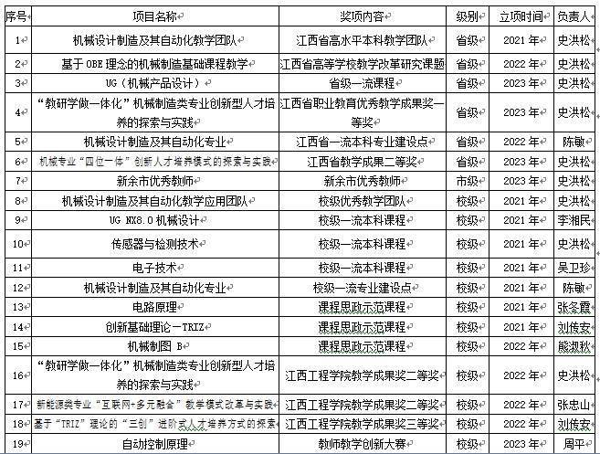 学院积极推进各项教学质量工程的建设,近三年在江西省高水平本科教学团队、省级一流专业、省级一流课程、省级教学成果奖等教学质量工程建设方面取得了丰硕的成果。截止到目前,学院获得了1个省级高水平本科教学团队、1个省级一流本科专业、1门省级一流本科课程、1个省级教学成果奖、2门省级精品课程、2个校级重点建设专业、1个校级一流建设专业、1个校级优秀教学团队、5门校级精品课程、3门校级一流课程。