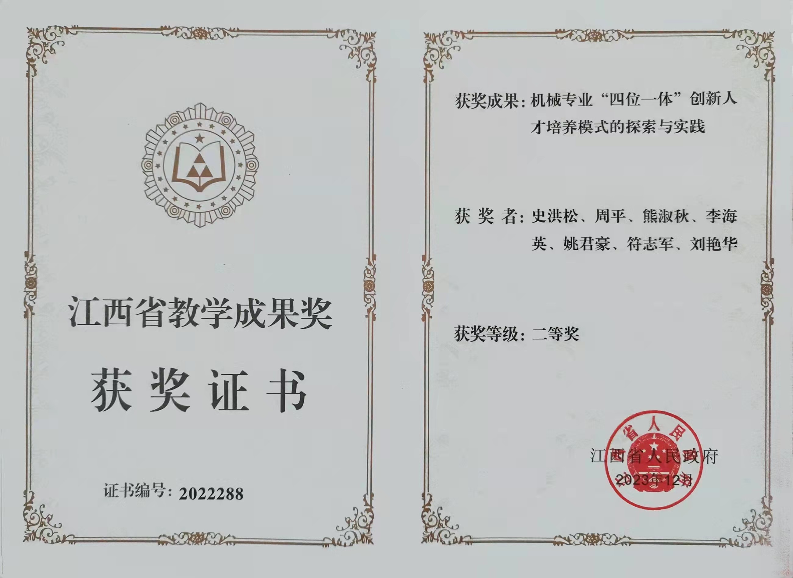 学校2023年获得省政府颁发的教学成果二等奖。智能制造与能源工程学院史洪松教研团队的《机械专业“四位一体”创新人才培养模式的探索与实践》获江西省教学成果二等奖。这是江西省政府首次颁发教学成果奖,beat365体育官方网站系四所民办本科院校获奖之一。智能制造与能源工程学院史洪松主持的《UG(机械产品设计)》成功申报国家级线上线下混合式一流本科课程。