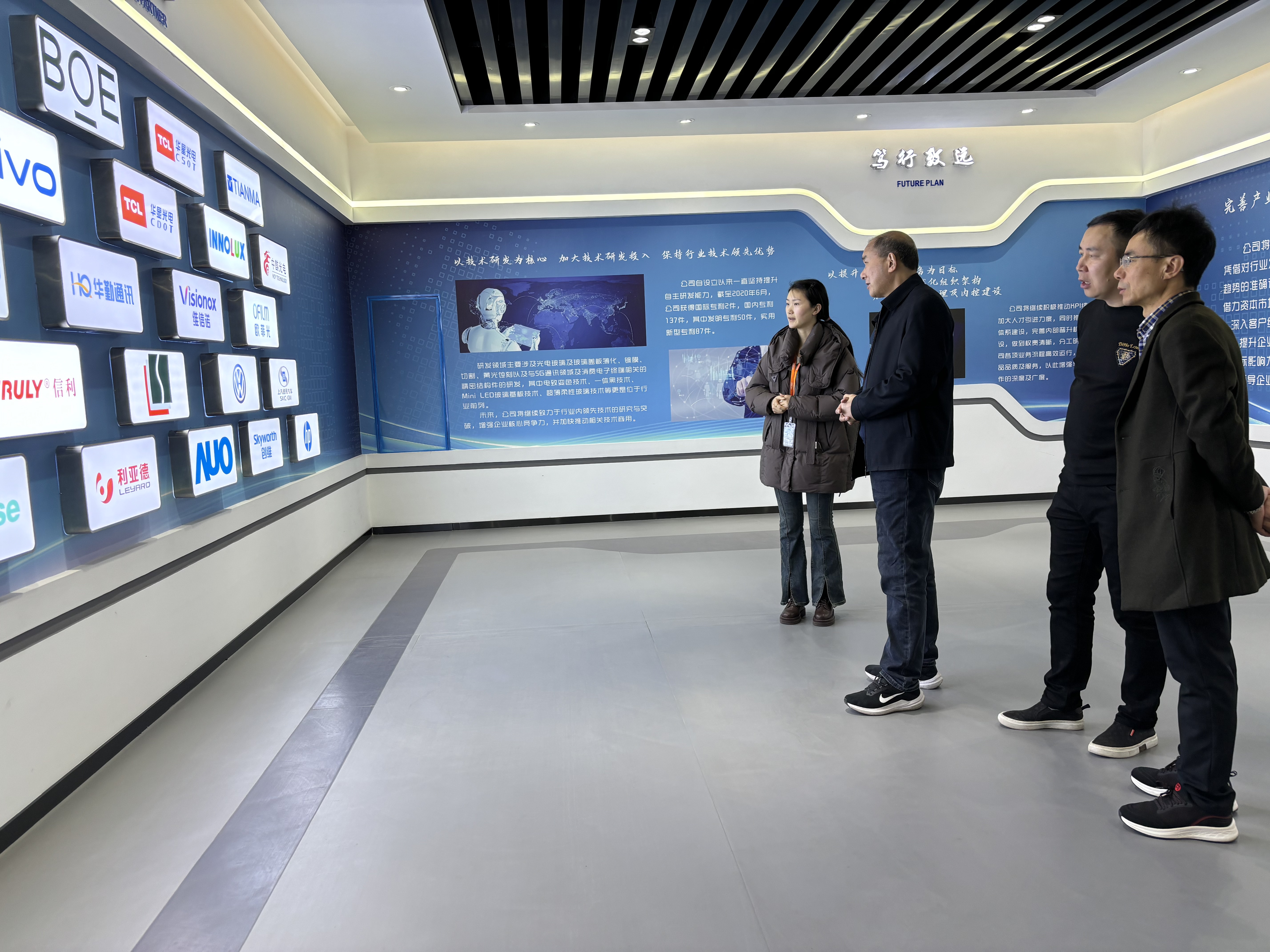在胡春花等领导的陪同下,史焕平校长一行先后参观了企业展厅和生产基地,详细了解企业的发展历程、技术创新、产品研发和市场运营等方面的情况。通过实地走访,校领导对光电信息行业以及沃格公司的研发实力和产业发展有了更直观地了解,为后续的合作奠定了坚实的基础。