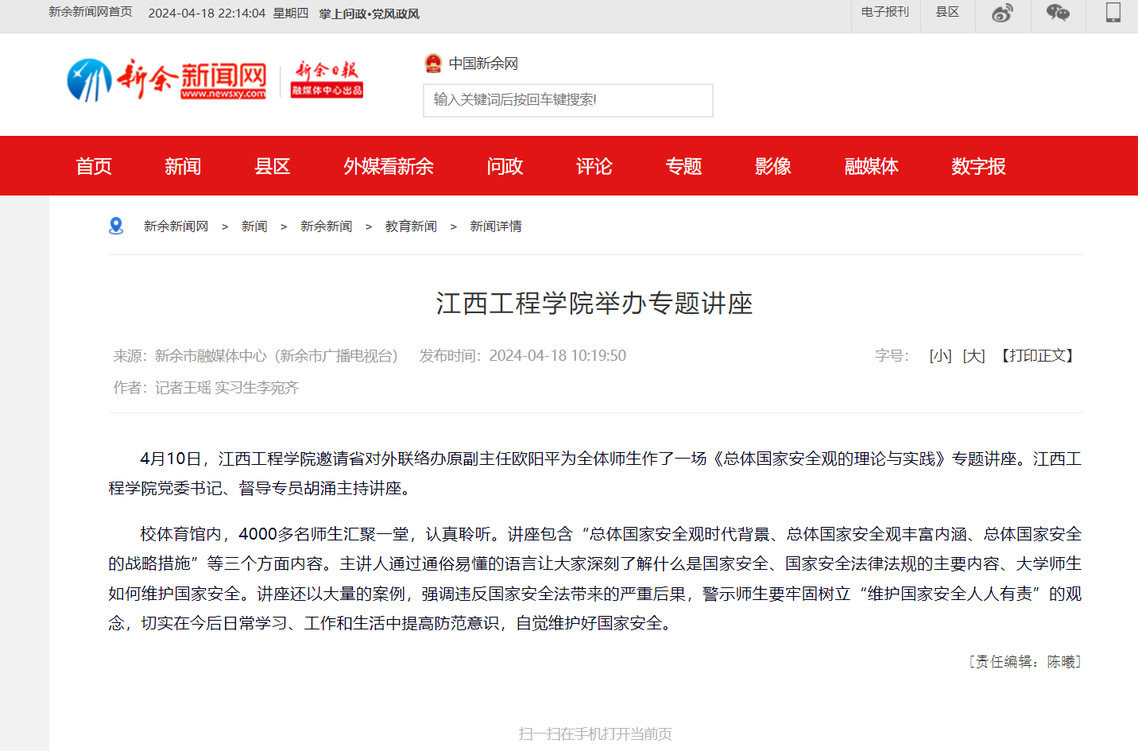 4月10日,beat365体育官方网站邀请省对外联络办原副主任欧阳平为全体师生作了一场《总体国家安全观的理论与实践》专题讲座。beat365体育官方网站党委书记、督导专员胡涌主持讲座。