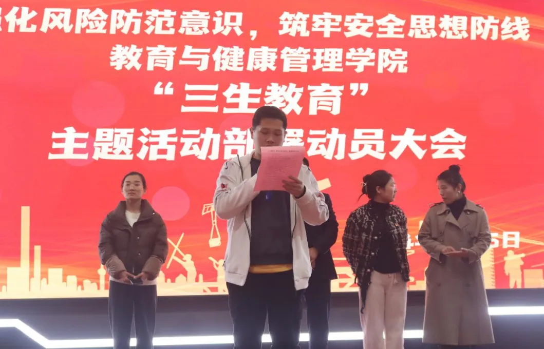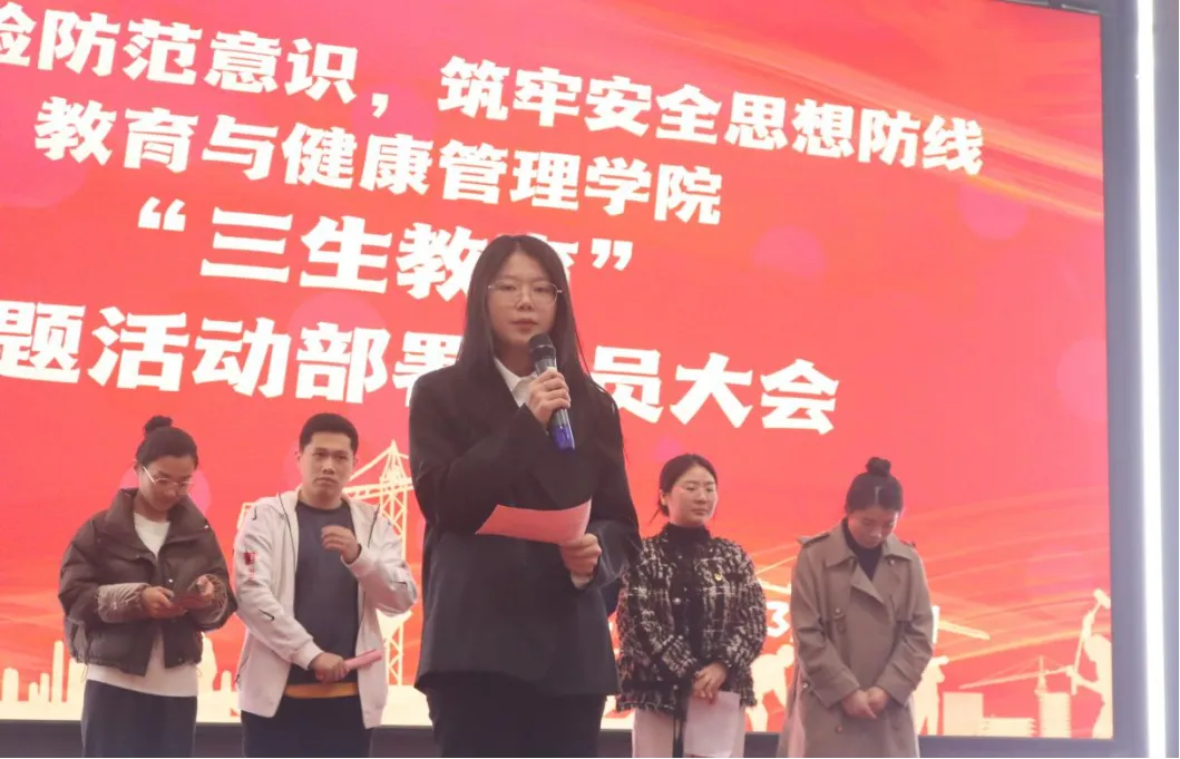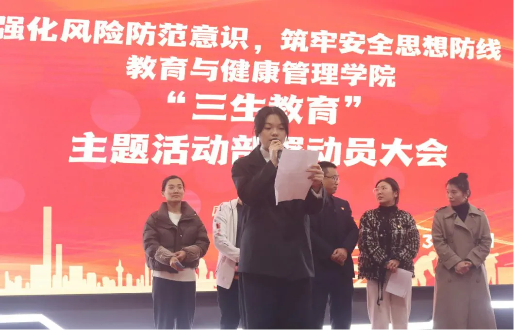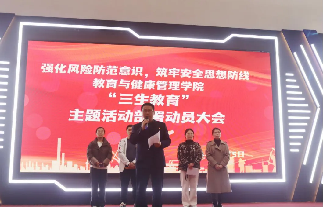 为了深入贯彻落实中共中央、国务院《关于加强和改进新形势下高校思想政治工作的意见》,坚持立德树人根本任务,进一步适应新形势、新任务的要求,增强教育活动的时代性、针对性、实效性,把青年学生培养成为中国特色社会主义事业的合格建设者和可靠接班人,引导广大学生树立正确的人生观、价值观,让学生懂得珍爱生命,学会生存,热爱生活。2024年3月15日下午15:00,beat365在第二课堂展厅召开以“强化风险防范意识,筑牢安全思想防线”为主题的“三生教育”主题活动部署动员大会。学院党总支书记刘永东、党总支副书记张沁、教师第一党支部书记高爽、学生党支部书记刘露、团总支书记胡子龙及教育与健康管理学院全体学生参会,会议由团总支学生会学术部辛丹怡同学主持。