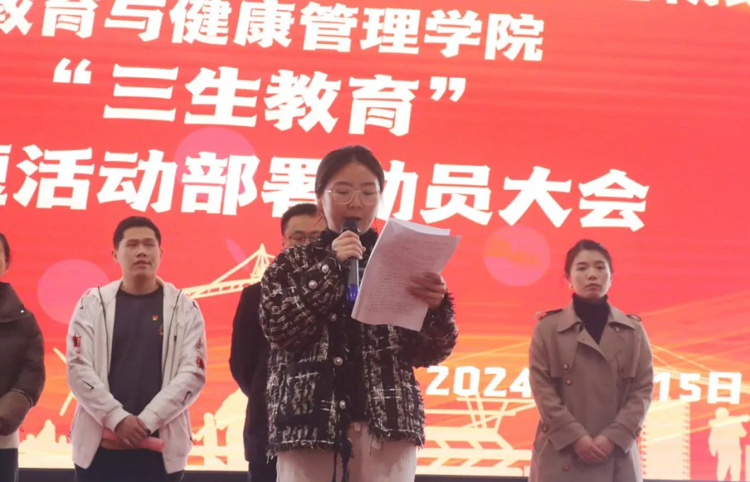 本次会议在激昂的校歌中拉开序幕。紧接着,党总支副书记张沁宣读了校政学字〔2024〕3号文件。文件指出,学校站在人文精神和科学精神融合的高度,以关注学生的生命、生存、生活为基本内容,切实解决学生的实际需要,关注学生成长、成才的过程,充分发挥学生的主动性和自觉性。开展“生命 生存 生活”主题活动有益于培养学生善待生命、关注生存、热爱生活的理念;着力于开启学生心智,培养学生的责任感、创新精神和实践能力;着眼于学生的健康成长、成人和成才,提高学生的健康水平,促进学生的全面发展。